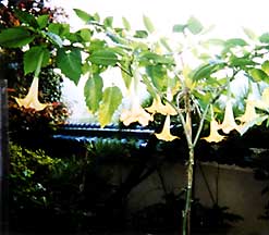 西別院町犬甘野の木寺さん宅で9月上旬から、エンジェルス・トランペットの花がピンク、黄色、白の3色が次々に花を咲かせています。