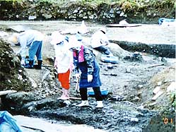 今日まで確認されていない周溝(幅約5メートル)の発見。また、その外側に幅2メートルの周溝が確認されており、二重の周溝は珍しいとのことです。今日までに須恵器は多数採集されていますが、10月に入って初めて、祭事に使われたと思われる壺の一片も発見されています。