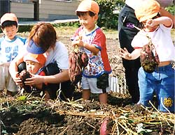 10月11日、本梅保育所の0〜5歳児89人がさつまいも掘りをしました。