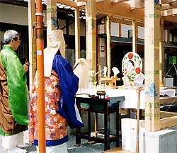 仏式による上棟式で住職並びに副住職の法要の後、世界の平和を願い、仏の慈悲に満ちた加護のもと、生活と庫裏の永久安泰を願う、願文を記した棟札を棟木に結合して祈願し、大工の打槌式を経て、住職と建設委員長の祝詞と檀家各位の協力に感謝し、完成に向けて一層の尽力を願うあいさつがありました。式後は祝宴で互いの労をねぎらい、伴を高められました。 |