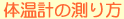 体温は体の部位によって違います。日本では一般に、わきの下の温度を測ります。ところで、昔から使われてきた水銀体温計は、水銀柱を35度以下に下げてから、水銀の部分をわきの下の中央に当てて腕を中央に密着させたまま、水銀柱が一定の値を示すまで挟んでおきます。水銀の目盛が動かなくなったときが、わきの下の温度です。それには8分〜10分ほどかかります。測る前にわきの下の汗を拭う必要はありません。長く挟んであれば、汗まで同じ温度に上がってしまうからです。