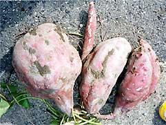 | [千代川地区・俣野正明情報員] 10月14日、千代川町北ノ庄の俣野勘平さん宅で、数個の芋がくっついた人の頭部のように大きく丸いのと、2個が一緒になった物と、1株に大小4個の芋がとれました。 |