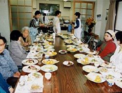 老人の健康に良い筑前煮、魚のさらさ蒸し、炊き込み寿し、食後の果物のメニューで実習されました。そして、区内の独居老人を招いて昼食会。出来上がった料理を食べながら、よもやま話に花を咲かせ、和やかにふれあいの楽しいひとときを過ごしました。