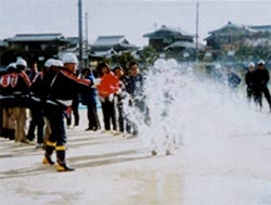 千代川町自主防災会及び各区役員、消防団員による防災訓練が11月4日、千代川小グラウンドで開かれました。消火器やバケツリレーでの初期消火訓練や消火栓からの放水訓練、負傷者の担架搬送など、いざというときにそなえた訓練を行いました。また、起震車での強震体験もしました。
