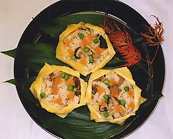 6.を包み込み、辺りに人参、ぎんなんを散らして盛り付ける。