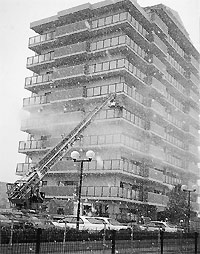 二月二十五日吹雪の中、千代川町今津にあるメディアス亀岡三番館で、高層建築に対応する防火、人命保護、防災を図るため消防訓練が行われました。