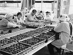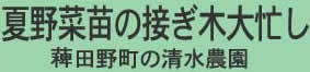 ひえ田野町佐伯の清水農園では、三月から四月にかけて夏野菜苗の接ぎ木作業に大忙し。地域の女性らの手も借りて、スイカやトマト、キュウリ、ナス等の連作を万能にする「赤ナス」「かんぴょう」の台木に接ぎ木する作業が進められていました。やがて広く皆さんに届くことでしょう。