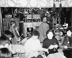 本堂にはお釈迦さまの涅槃仏画が掛けられ、みなせんで作られたご馳走と花を供えてお釈迦さんをしのびつつ、悟りを開かれたしるしとして小豆ご飯を供えて食事をされました。また、奥様のキーボード伴奏に合わせ「涅槃御和讃」の詠唱を唱え、念珠くりをされました。