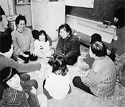 冷たい風の吹く校庭では竹とんぼを飛ばし、少しずつ上手に飛ばせるようになり、夢中になる子供たちの姿に老いの身も忘れて一緒に遊びました。お別れにお子たちの画をプレゼントしていただき、「また来てね。いつ来るの。ありがとう」の声に送られたうれしい交流でした。