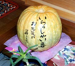 曽我部町寺の小瀬露子さん宅を訪問すると、「いらっしゃいませ。お元気が嬉しくて」と書かれた、大きなカボチャが出迎えてくれます。露子さんが自家菜園で丹精して作られたもので、昨年十一月に収穫。その後、ずっと玄関に飾られています。 (3/19取材)