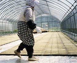 ひえ田野町天川の大西正弘さん宅では、今年もJA亀岡市の委託を受け、水稲苗の育成作業をされていました。発芽三日目を二十日余り、ビニールハウス内で管理され出荷されます。