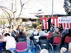 入所者の中には、百四歳の市内最高齢者・開本アキ子さんをはじめ九十人が車イスで、その家族とともに職員、地元の人も手をたたきつつ綿菓子、ぜんざい、甘酒、たこ焼き等が振る舞われ、満開の桜も微笑む楽しいひとときを過ごしました。入所者が花束の贈呈をして城さんと握手をし、しばらく手を離さない光景にドッと笑いが沸き起こる場面もありました。 |