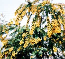 吉川町穴川の大西辰治さん宅の玄関に、「ミモザ」という珍しい木があり、黄色の花が鮮やかに咲き誇っていました。