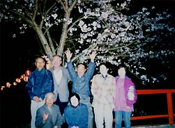四月七日、曽我部町犬飼区天満宮前の犬飼川堤防に、十年前に老人会が植えられた桜が生長して満開となりました。老人会が毎年手入れをされ「大変立派になりました。区内有志が初めて老人を招いて夜桜の下で花見を。大変楽しいひとときを過ごされました。