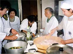 東本梅町老人会「福寿会」では四月二十五日、料理作りの研修会を開きました。 初めてとなる今回は、食改役員さんに指導していただき、「漬物・梅干しの和風ご飯」「筑前煮」作りに取り組み、お昼には試食をして反省会をしました。