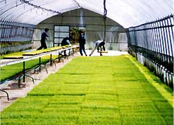 JA亀岡市の委託を受けて九年になる今年も、四千箱余りの育苗に取り組んでいて、後数日で田植えが始まる同町では、本田への出番を待つ早苗が四棟のハウス内で青々と育っていました。