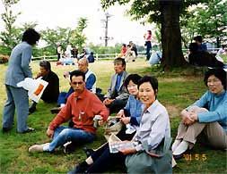 今年は「あやめ池」で参加者は四十七人。到着後は自由行動になり、家族や友達同士で目的の乗り物に直行。子供のいない者は芝生に腰を下ろし、仕事に追われる日々を忘れて話に花を咲かせていました。
