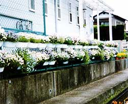 千歳町毘沙門の主原久子さんは、息子さんが千代川町に開業されている医療施設の外周りの金網に、五十数個のプランターを使ってノースポール、ビオラ、ナスタチウム等、鮮やかに咲いた花々を見事に飾られています。「これらの花は、すべて自宅のビニール張り温床で種をまき、苗を育て、花を咲かせるのが楽しみでやっております」と言いながら、楽しそうに花作りに励んでおられます。以前、市緑花協会の花コンクール(第十三回)で入賞されたこともあります。