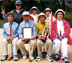 平成十三年度JA亀岡市年金友の会春季グラウンドゴルフ大会が四月二十七日、馬路町の市営月読橋球技場で開かれ、畑野Bチームはトマリ賞も続出し見事優勝されました。また、個人賞でも男子一位に山内拡治さん、女子二位に中井京子さんが入賞と好成績を収められました。