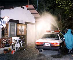 これは、京都松竹芸能の「片栗家の幸福」という映画の一シーンの撮影で、本梅駐在所を軽井沢の山の中の駐在所という設定で約一時間半、雨のシーンが撮られました。迫力ある俳優の方の演技に、近所の方々も大勢かけつけテスト、本番と見入っていました。この映画の上映はまだ未定とのことでした。