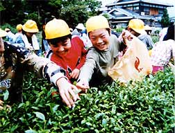 五月二十五日、千代川小学校恒例の学校茶園の茶摘みが行われました。一校時からはPTAのお母さんたちが、二校時には五、六年生の児童が、そして三校時には一年生も参加して摘み取りました。