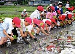 今年は五年生がお手伝いとして、またお母さん方も数人出て手伝い、一緒に水田へ足を踏み入れました。五年生が見本を示し指導して、二年生は泥だらけになりながら植え付けました。