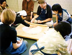 そばの香りを楽しみながらの約1時間。そば打ちは初めてということですが、さすがに毎日パンをこねているとうまいものです。そして、出来上がったそばを大釜でゆがいて、いよいよ試食。「お箸は?」と思いきや、とても上手に使われていました。旅の良い思い出の一コマになればよいのですが……。