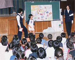 雨であったため教室でビデオを見た後、体育館で市婦人交通指導員から図面を使って危険箇所の説明を受け、児童が危い所に印を付けていく方法などで、道路の横断などについて指導を受けました。