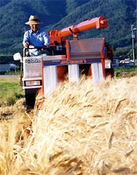 今年も順調な天候に恵まれ、川東地域の麦の生育は良好。集団転作された一面の黄金色に色付いたビール大麦の刈り取りが、田植えをひかえた晴れ間をぬって一斉にスタート。JA機械銀行のコンバイン2台、各農家組合のコンバイン四台が5月28日、馬路町のビール大麦の作付面積約20町のほ場に繰り出しました。