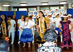 入所者全員がハイビスカスの花を頭につけたり、レイを首につけ、車イスでハワイムードの中、拍手はおしみなく、また井上さんの月、山、花等の手による表現の方法と解説と手振り、お尻振りの指導を受け、「月の夜半」の曲を踊り子とともに、職員も参加して練習されました。その中に入所者1人が参加し元気良く踊り、みんなの喝采を受けたり、楽しいひとときを過ごしました。 |