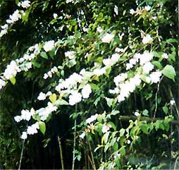 「卯の花のにおう垣根に」と歌われている卯の花が今、東別院の野山にきれいに咲いています(6月13日撮影)。垣根に使われているのは見掛けませんが、高さ1.2メートルぐらいで白い小さな花をつけ、枝が中空になっています。