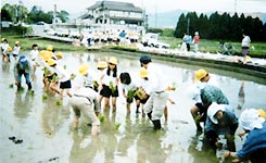 初めて水田の中へ裸足で入り「キャー、つめたい」などと歓声を上げながら、苗を片手にJAの待田営農指導員のもと、無事終えることができました。