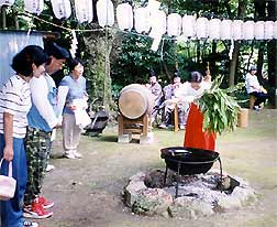 13日の宵宮には夜店も出て多くの子供たちでにぎわいました。本宮では湯立神楽が奉納され、大きな釜に湯が沸され、お塩・お酒・お洗米が入れられて清めた後、笹につけた湯のしずくをかぶり、氏子の皆様方の1年間の家内安全、無病息災と無事をお祈りされました。