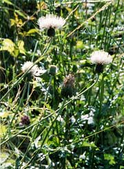 畑野町千ヶ畑今西の田んぼの畦草刈りをしていたところ、紫色の花の中に白いアザミの花1株を見つけました。(6月17日)