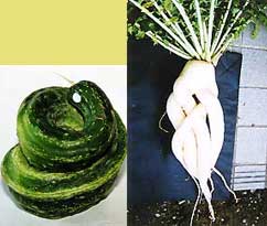 6月24日、東別院町鎌倉の井上馨さん宅で、6本の足が組みひものような大根がとれました。(写真右)
