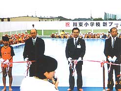 新設工事が進められていた川東小学校のプールが完成し6月21日、市長をはじめ多数の関係者を迎えてプール開きが行われました。全校児童317人も参加し、真新しいプールで初泳ぎしました。