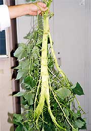 吉川町穴川の関与兵衛さん宅のさつまいも畑で、ツルが帯状に平たくなったものが発見されました。