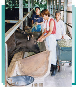 | ■原田さん宅の今現在の経営内容と、これまで取り組んでこられた経緯をお聞かせいただけますか―― うちの経営は肉牛肥育、米、シイタケ生産の三本柱でやってきています。肉牛は今二百三十頭程いるんですか。田んぼは約一町七反あって、今年は水稲の作付けが約一町一反、あとは転作等です。シイタケは去年が二千本、今年は一千本の植菌。多いときは一万本程植菌したこともあったんですが、輸入自由化で値が崩れてしまって十年程前からは減らしています。シイタケが経営の柱だったんですが、肉牛肥育にウエートを切り替えてきているんです。 それと、私が農業に従事するようになったのは三十一歳からです。亀高を卒業して、それまでは運送業をしていたんです。昭和四十六年から三十頭規模で肉牛肥育を始め、翌年からシイタケ栽培にも取り組みました。三千本植菌して、それから増やしていきました。米は一町二反程でした。その時分、転作はなかったので正味です。 昭和六十三年やったかな。五十頭規模の牛舎を増築。そして平成七年、十二年、今年と、それぞれ五十頭規模の牛舎を増築してきたんです。それと、去年には法人化し有限会社「原田畜産」としてスタートを切り、十月から中村君を迎えて、また今年四月から息子も加わり、三人で肉牛肥育に励んでいます。 |