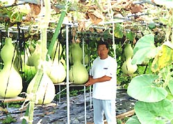 旭町美濃田の平井精一さん宅では、今年も色々な形のひょうたんが畑いっぱいに作られています。平井さんは毎年、同町文化祭に素晴らしいひょうたん細工を数点出品され、展示場に来た人々の目を和ませています。
