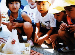 川東保育所では、みんなで可愛がっているチャボの愛ちゃんと、ももちゃんが卵を温めだして五月と七月に雛がかえり、園児たちは大喜び。大きくなるのを楽しみに毎日、そっと見守り育てています。