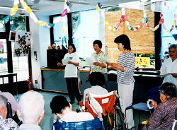 高齢者の方にも楽に行えるレインボー体操で体をほぐし、童謡を合唱するなどして友好を深めました。懐かしい歌とはいえ、歌詞カードも見ずにスラスラ歌われるのには驚きでした。