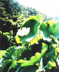 宮前町神前の人見徳康さんは、3年程前から休耕田を借りて蓮を栽培されており、その蓮がピンク、白色の花を見事に咲かせ、人々の目を楽しませています。 |