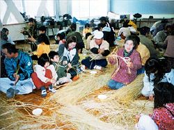 慣れない手付きで稲わらを7本、5本、3本と順に寄り合わせていきますが、なかなか縄の状態によじれません。手を取っての指導で何とか作り上げたしめ縄で、お正月をお祝いしようと、みんな笑顔の教室でした。