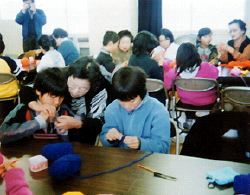 ひえ田野小学校で12月4日、ふれあい学級が開かれました。5年生児童と同町老人会のおばあさんたち約20人が2人1組になって、アクリルの毛糸で食器洗いの編み物に取り組み、ふれあいのひとときを過ごしました。
