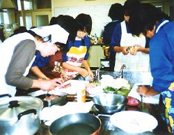 今回は、東西別院の食生活改善委員さんを講師に、アジのにぎり寿司やおひたし、実だくさんのみそ汁等を教わりました。全校生徒から希望者を募っての実習でしたが、「家でも時々作っている」という男子生徒のたのもしい声も聞かれ、なかなかの出来ばえでした。