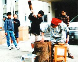 収穫の喜びをかみしめ餅つきをする児童
