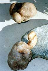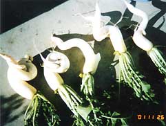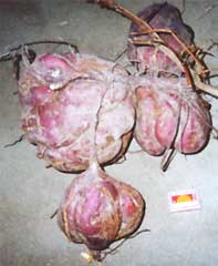 [千代川地区・俣野正明情報員] 千代川町川関の八木秀夫さん宅で、「亀」と「カルガモ」に似た山の芋がとれました。 |