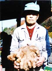 | [東別院地区・加賀山千代情報員] 東別院町南掛の荒木壁夫さん宅で12月1日、木の株の根っこのような重さ6.5キロもある山の芋がとれました。 |