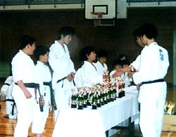 この日は気合鋭く稽古納めをした後、表彰式には保護者をはじめ道場生約百人が出席し、稽古に励み優秀な成績を残した道場生に稲荷晴之館長からトロフィーが贈られ、全員の大きな拍手で功績をたたえました。
