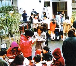 大井町の「サンクメルベーユ並河」では12月22日、「グリーンコープ並河」では23日、入居者交流のもちつき大会が行われました。 この日は全員でマンション周辺の清掃をした後、待望のもちつき大会。サンクでは焼きいもや野菜販売、グリーンコープでは消防署による防火教室等も行われました。